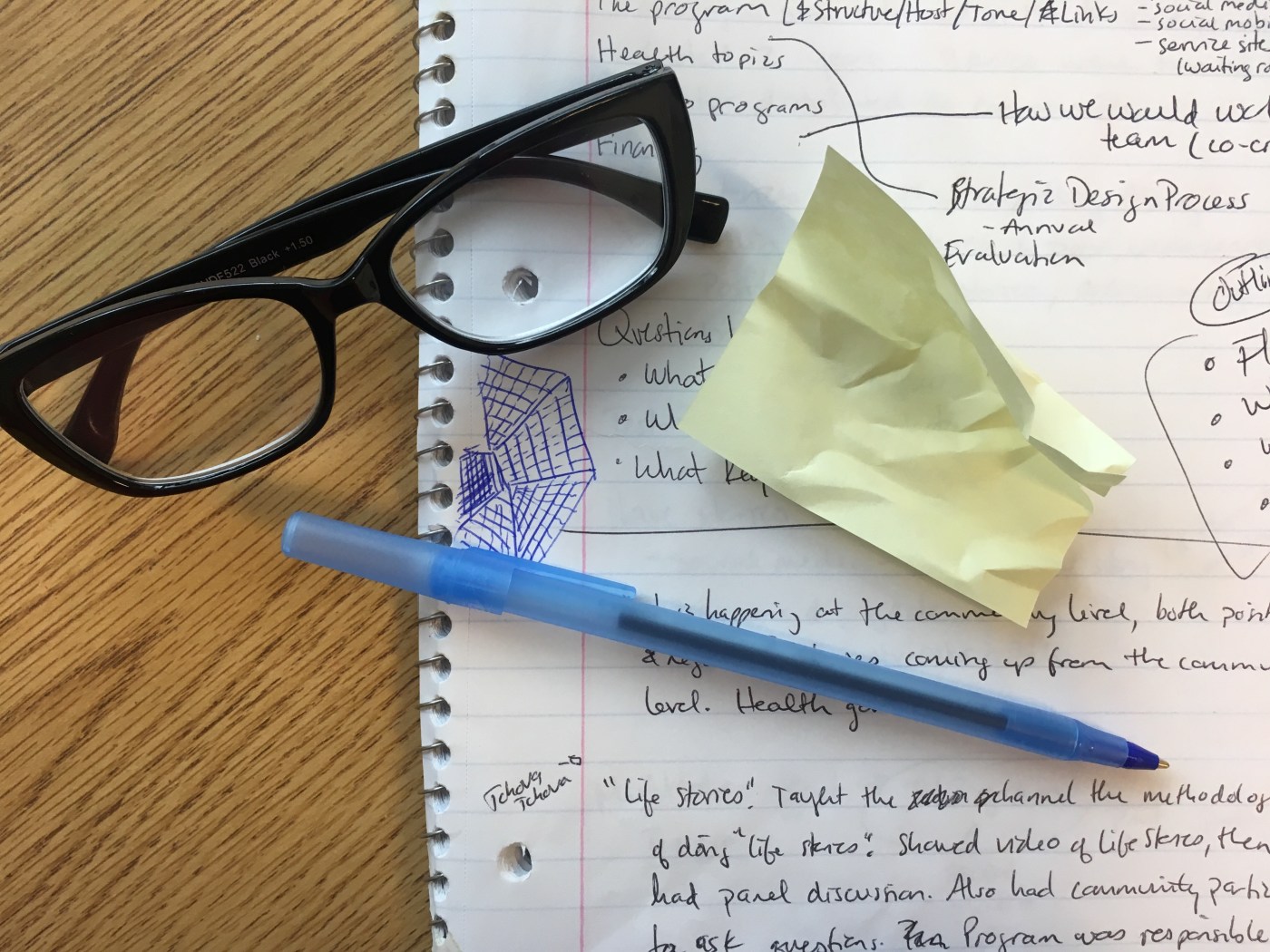 The first (obvious) purpose of note-taking is to provide a record of what happened in a meeting, or what happened in your own head. The problem, I have always found, is that it is hard to think and take notes at the same time. Maybe that’s just me? I can either scribe, or I can think. Pick one. But since I often do need to do both, I flip between listening/thinking/speaking and taking notes. In small meetings, or where precision is critical, I will often ask people to pause so I can finish getting important things down before the conversation moves on. Mostly, though, I try to listen and be present.